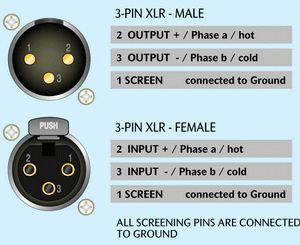 Pin 1 je používán jako bezpotenciálový a spojuje se se zemí, stíněním kabelu nebo s kovovými částmi přístrojů. Pin 2 je označován jako HOT, je na něm přítomen neinvertovaný signál, jeho pravým opakem je Pin 3, kde je signál pinu 2 invertován. Důvod tohoto uvidíme na následujícím příkladu.